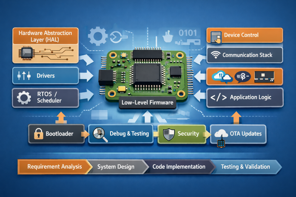 Our expertise includes embedded software development, firmware architecture, and application-level design.
